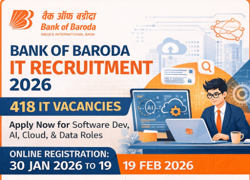 Bank of Baroda (BoB), one of India’s largest public sector banks, has officially released the IT Recruitment 2026 notification for hiring skilled professionals across multiple technology roles. A total of 418 vacancies are announced in the Information Technology (IT) Department on a regular basis.
