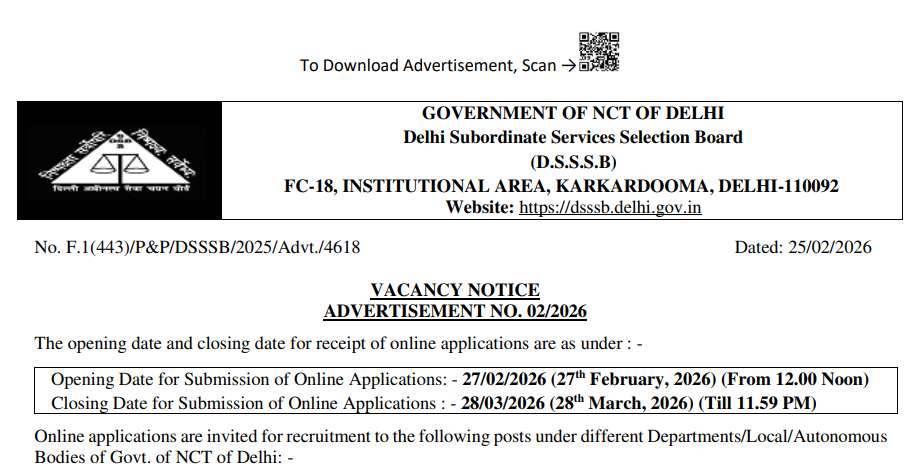 The Delhi Subordinate Services Selection Board (DSSSB) has officially released the Recruitment Notification 02/2026, inviting online applications for 216 vacancies across multiple departments under the Government of NCT of Delhi. This recruitment drive offers excellent opportunities for candidates seeking stable Delhi government jobs in technical, non-technical, and professional roles.