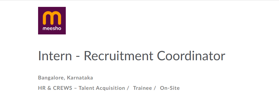 Are you a fresher or recent graduate looking to step into the world of Human Resources and recruitment? Meesho is offering an exciting opportunity for aspiring HR professionals to join as an Intern – Recruitment Coordinator in Bangalore, Karnataka. This role is ideal for candidates who want hands-on exposure to talent acquisition in a fast-growing, high-impact e-commerce organization.