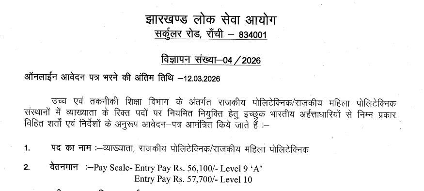 The Jharkhand Public Service Commission (JPSC) has officially released the Lecturer Recruitment Notification 2026 for appointment in Government Polytechnic Institutions of Jharkhand. This recruitment drive offers an excellent opportunity for candidates holding Engineering, Technology, Science, and Humanities qualifications to secure a permanent government teaching job.